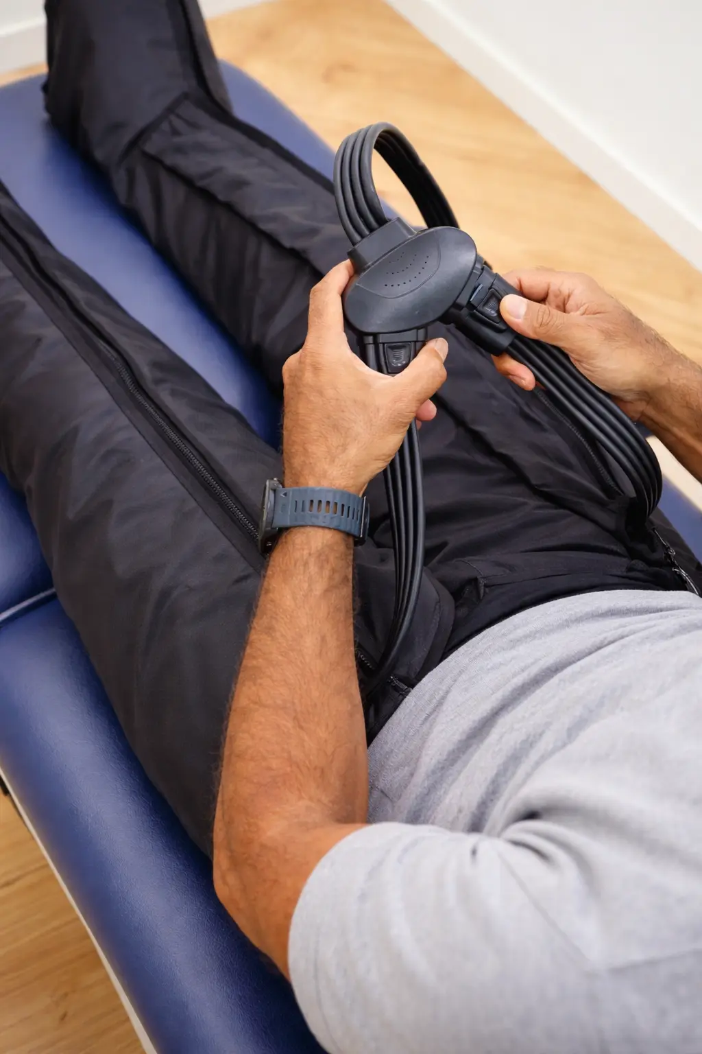 You stay fully clothed and reclined while the machine cycles through the chambers. Pressure can be adjusted between 30-150mmHg, and we can choose from different modes depending on whether you want light recovery or a deeper, more athletic massage.